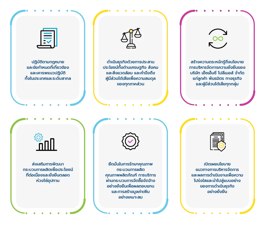 ทั้งนี้ ผู้บริหาร พนักงาน บริษัท เอ็ชเอ็มซี โปลีเมอส์ จำกัด ทุกคน มีหน้าที่สนับสนุน ผลักดัน และปฏิบัติ ให้สอดคล้องกับนโยบายการบริหารการจัดการความยั่งยืนที่กำหนด