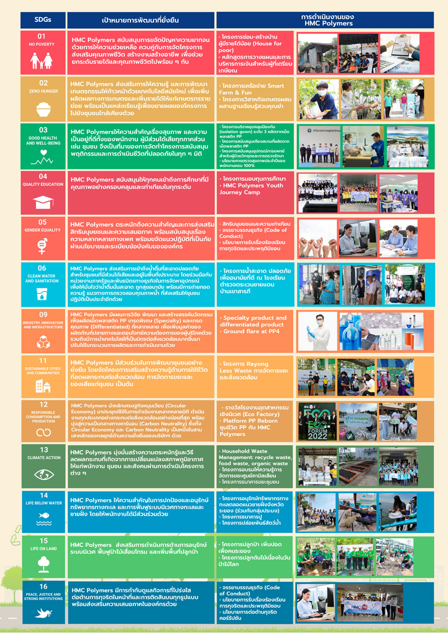 HMC Polymers ปฏิบัติตามเป้าหมายการพัฒนาอย่างยั่งยืนขององค์การสหประชาชาติ ผ่านการดำเนินโครงการและกิจกรรมต่าง ๆ ดังนี้