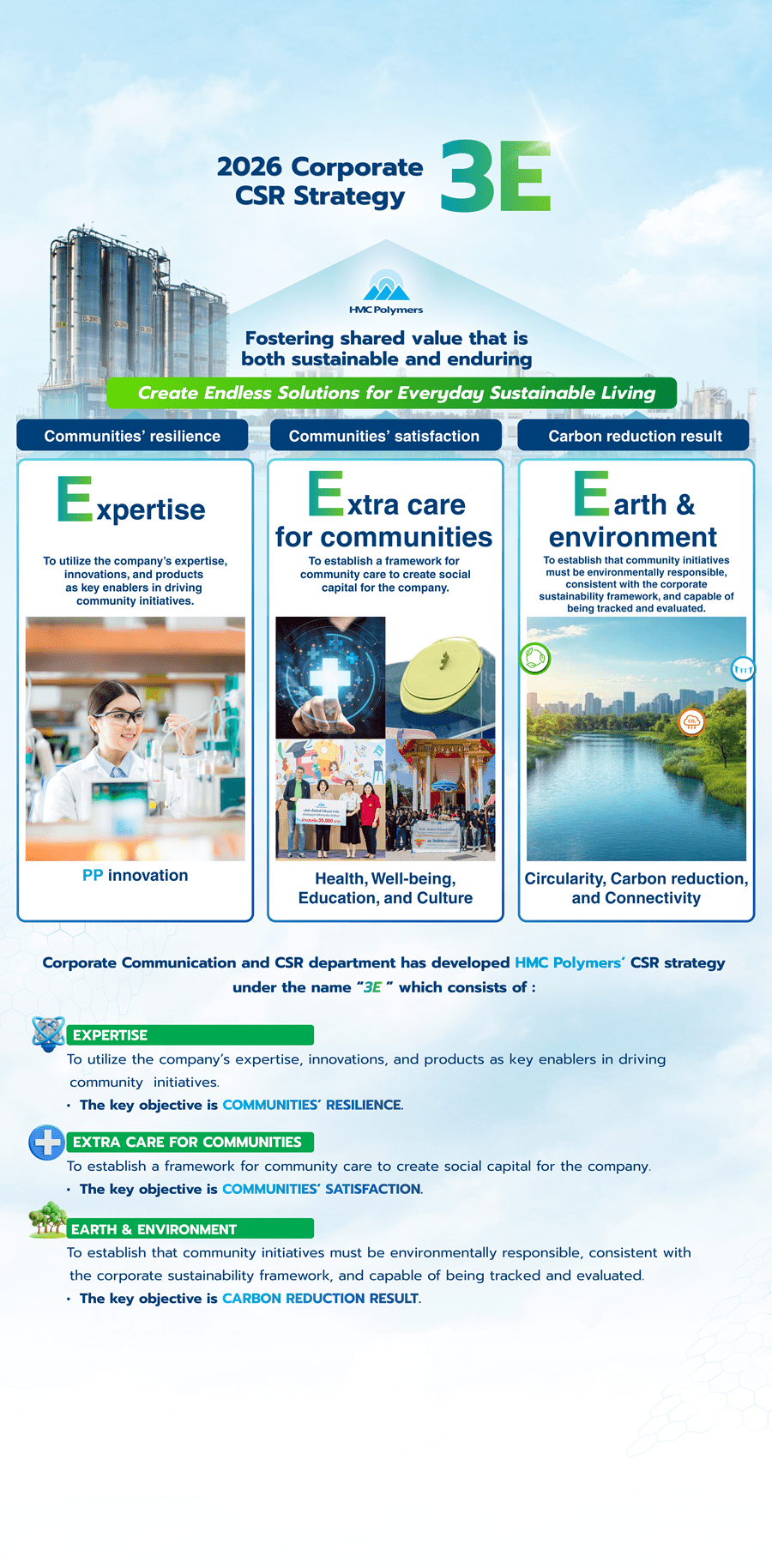 HMC Polymers operates business with corporate social responsibility with full awareness and value given to supporting activities for society and adjacent communities. We continually pay attention to their well-being and desire to work with related parties by forging ahead with the development and extension of cordial relations, which arise from mutual acceptance and trust. Along the way, we take into consideration potential impact on stakeholders, society at large, and the country while cultivating attitudes and a corporate culture of acting responsibly with co-existing society.