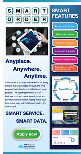 SmartOrder is an easy to use online ordering system that is accessed through the HMC Polymers' website via PCs, tablets and smartphones. The system provides "Smart" features such as Create, Search, Print and Save functionalities that help to make your HMC order easy to initiate and track – it's that simple!
