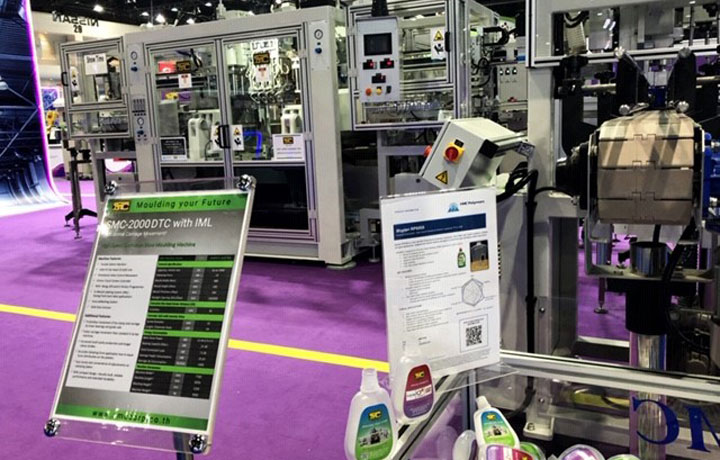SMC Corporation and HMC Polymers have a history of close collaboration and organized a special demonstration session for the Expo to display the SMC state-of-the-art MC-2000DTC EBM machine with a technically advanced In-Mold Labelling (IML) system for 4 cavities CD85 (100 ml), with a maximum production capacity of 1,920 bottles per hour and fully equipped with conveyer and edge polishing unit.