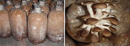 Mushroom loaf (see image above left) contains mushroom spores for cultivation and is used as the media for mushroom growth (see image above right). The mushroom loaf can be made from saw dust, chaff or any similar materials to support mushroom propagation and bloom. Farmers blend saw dust and a variety of other materials together with mushroom spores and pack them in bags (mostly plastic) and ferment the mix until the spores fully grow in the plastic bag containers and emerge as shown above.