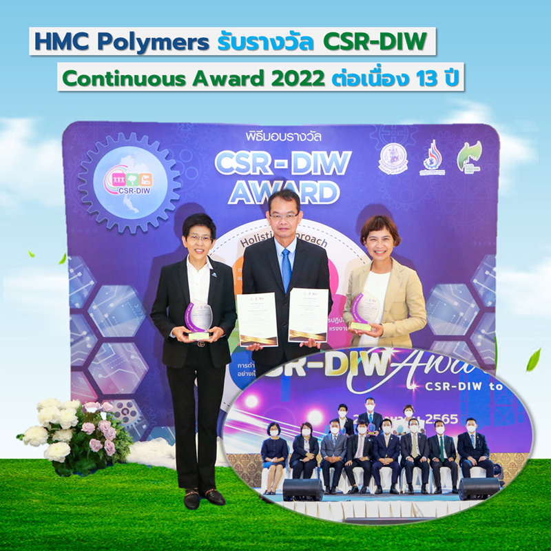 เมื่อวันที่ 24 สิงหาคม 2565 ณ ห้องรอยัล จูบิลี่บอลรูม อาคารชาเลนเจอร์ อิมแพ็ค เมืองทองธานี จังหวัดนนทบุรี HMC Polymers นำโดยคุณอังคณี สุนทรสวัสดิ์ รองประธานสายการเงิน บัญชี และงานสนับสนุนองค์กร คุณชาตรี พลับพลา รองประธาน สายงานปฏิบัติการเพื่อความเป็นเลิศ และ คุณบุปผาพรรณ พานทอง ผู้จัดการฝ่ายกิจการเพื่อความรับผิดชอบต่อสังคม เข้ารับโล่และเกียรติบัตรรางวัล CSR-DIW Continuous Award 2022 จากกรมโรงงานอุตสาหกรรม กระทรวงอุตสาหกรรม ภายใต้โครงการส่งเสริมโรงงานอุตสาหกรรมให้มีความรับผิดชอบต่อสังคมและชุมชน เพื่อเป้าหมายการพัฒนาที่ยั่งยืนต่อเนื่องเป็นปีที่ 13 ทั้งโรงงานผลิตเม็ดพลาสติกโพลีโพรพิลีน (โรงงาน PP) และ โรงงานผลิตสารโพรพิลีน (โรงงาน PDH)