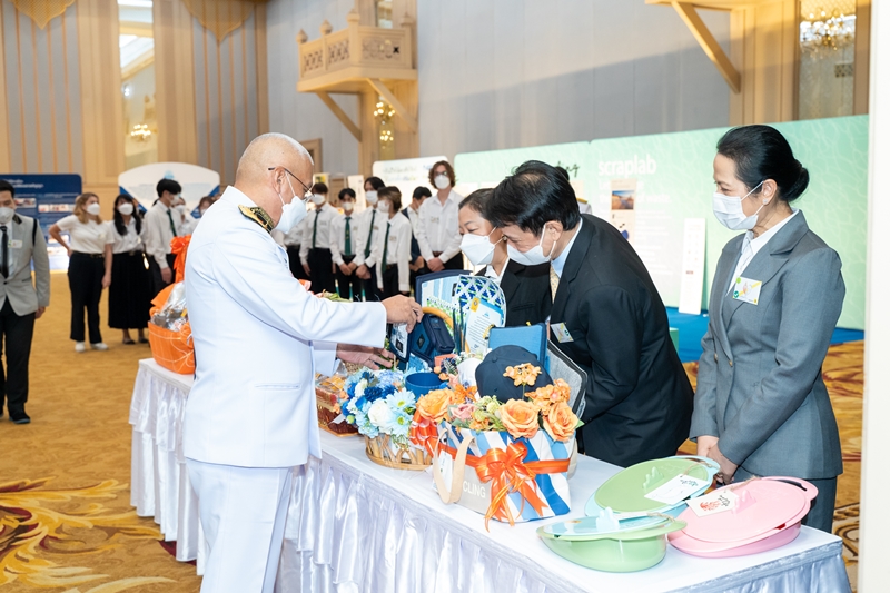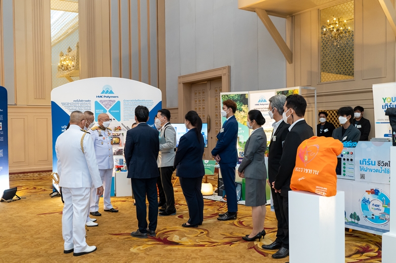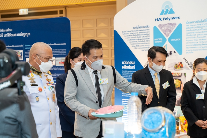 After the meeting, Her Majesty's representative was briefed on the production of PP Upcycling Bedpans by the executives of HMC Polymers Company Limited (HMC Polymers), namely Mr. Pornchai Pichitwutikorn, Senior Vice President of Business, Strategy, Innovation, and Commercial, and Ms. Kessaraporn Trongtorsak, Vice President of Sales, Marketing, and Innovation. This project is part of the collaboration between HMC Polymers, J.C.J. Company Limited (Double Lock), Environmental Design Creative Center, Faculty of Architecture, Kasetsart University, Pollution Control Department (PCD), and the Department of Marine and Coastal Resources (DMC).