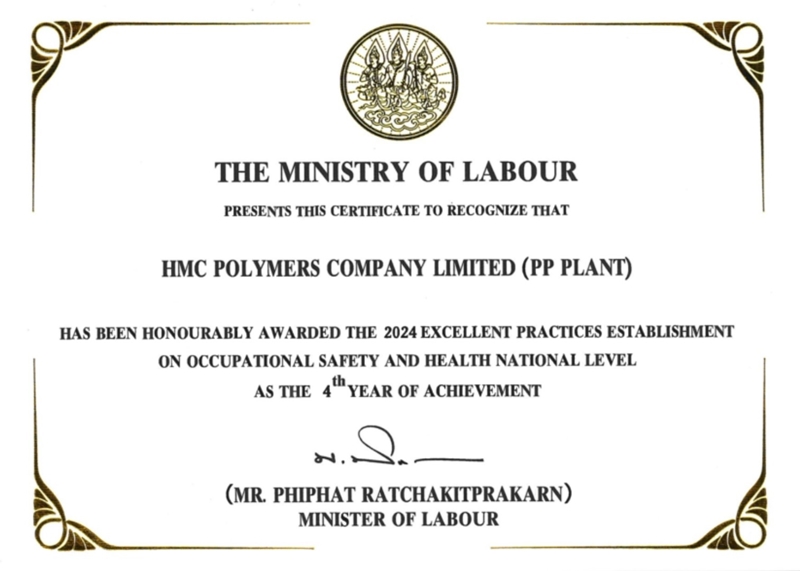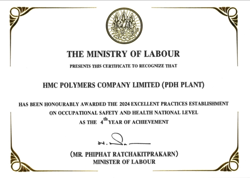 On August 7, 2024, HMC Polymers company limited (HMC Polymers) a leading manufacturer of premium-grade PP (polypropylene) resin in Thailand and Southeast Asia, received the outstanding Award for Safety, Occupational Health and Environment (Gold Level) for 2024. This recognition was awarded to the PP Plant and PDH Plant for the fourth consecutive year. The award was presented by Mr. Wanarat Srisuksai, Deputy Permanent Secretary of the Ministry of Labor, with Mr. Sarawut Chiengek, Operations PP3 & 4 Department Manager, and Mr. Nitikom Prompitak, Operations PDH Department Manager, receiving the honor on behalf of the company at the Star Convention Hotel in Rayong Province.