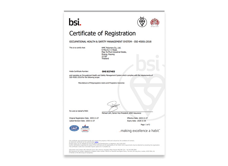 เมื่อวันที่ 9 สิงหาคม พ.ศ. 2566 บริษัท เอ็ชเอ็มซีโปลีเมอส์ จำกัด รับรางวัลธงธรรมาภิบาลสิ่งแวดล้อม (ธงขาวดาวเขียว)" ประจำปี 2565 สำหรับโครงการโรงงานผลิตสารโพรพิลีนได้รับรางวัลธงธรรมาภิบาลสิ่งแวดล้อม (ธงขาวดาวเขียว) ต่อเนื่อง 12 ปี ตั้งแต่ปี 2554 ถึงปี 2565